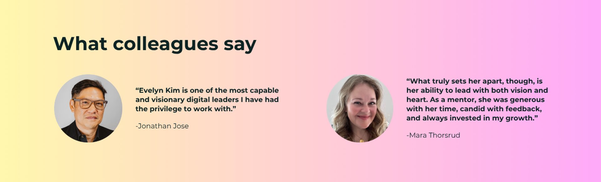 ”Evelyn Kim is one of the most capable and visionary digital leaders I have had the privilege to work with.”