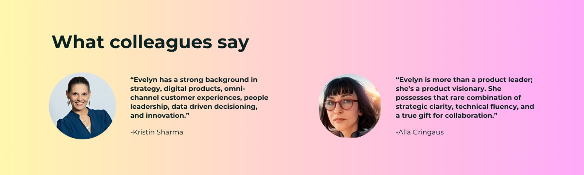 ”Evelyn is more than a product leader; she’s a product visionary. She possesses that rare combination of strategic clarity, technical fluency, and a true gift for collaboration.”
